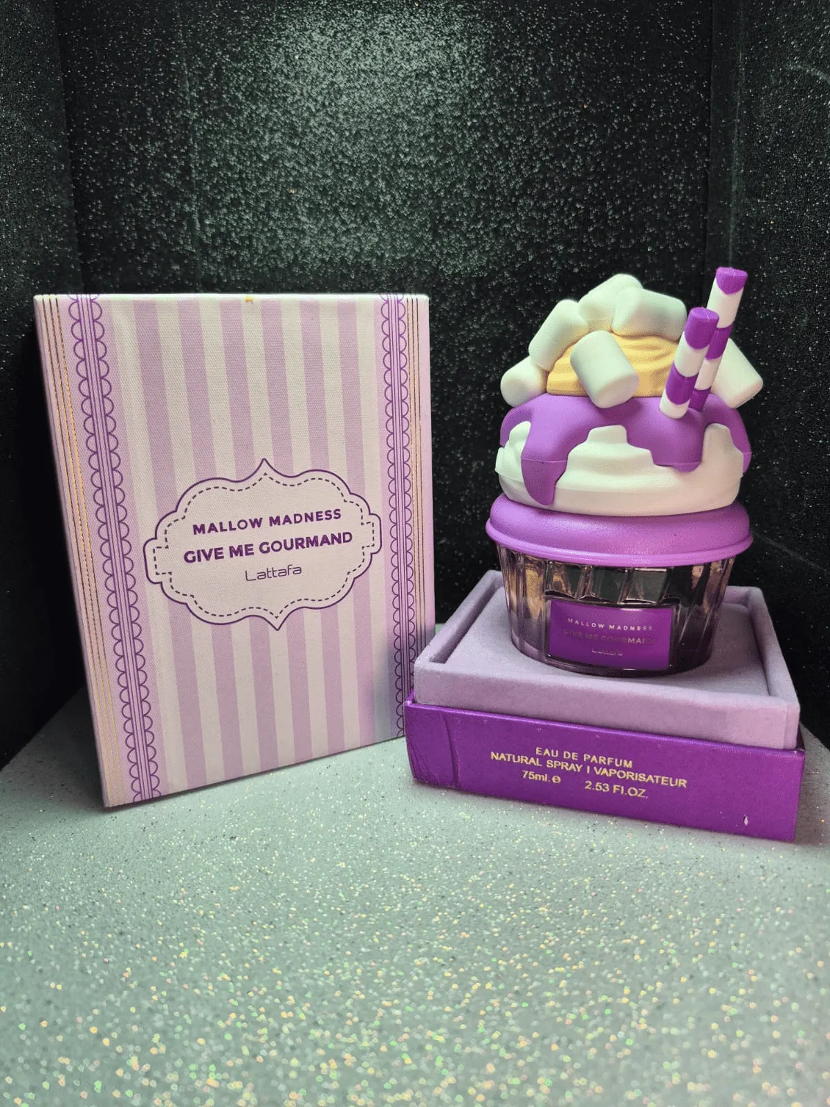 Perfume árabe Mallow Madness Lattafa en frasco morado con diseño de postre y caja.