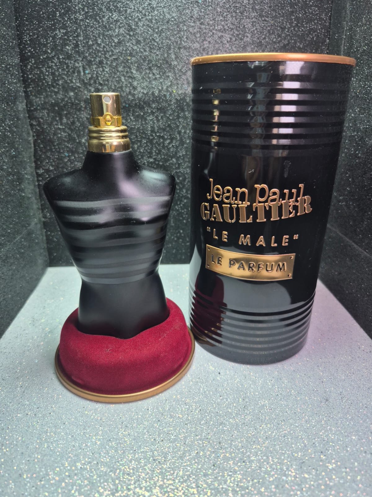 Perfume Jean Paul Gaultier Le Male Le Parfum para hombre en frasco de torso negro mate y dorado con lata.